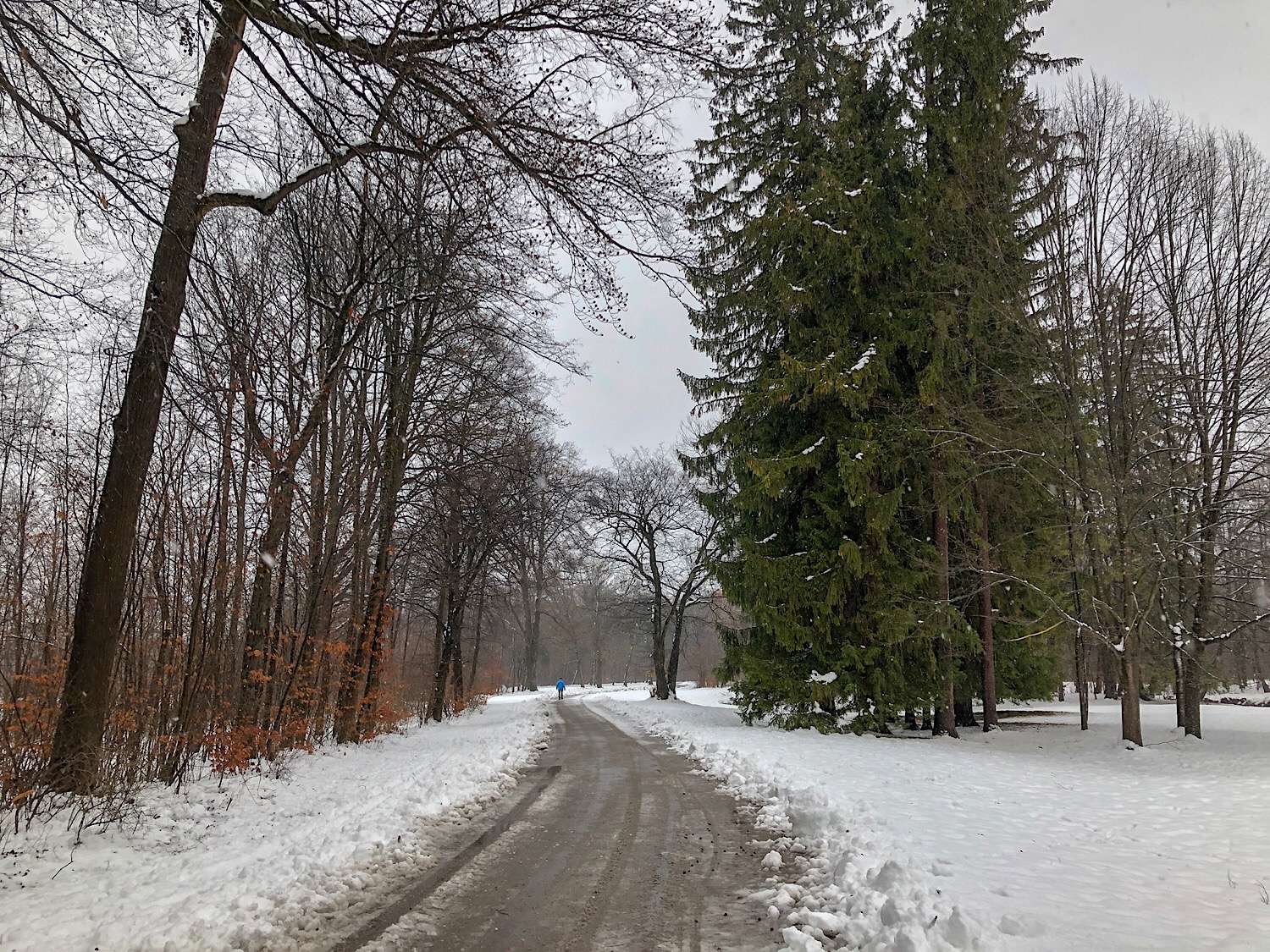 At 0913 I catch the U6 from Marienplatz to Studentenstadt. I want to explore the northern end of the Englischer Garten. I arrive at Studentenstadt at 0922 and make my way to the park. The northern part is less open and more like woodland, at least under snow. There is light snow falling and a few people around, mainly walking dogs or jogging. I walk all the way down to the southern part where I was yesterday. It’s still white but the paths are clearly worn. They are quite sludgy too. It was lots of fun walking through the snow, but very hard work.